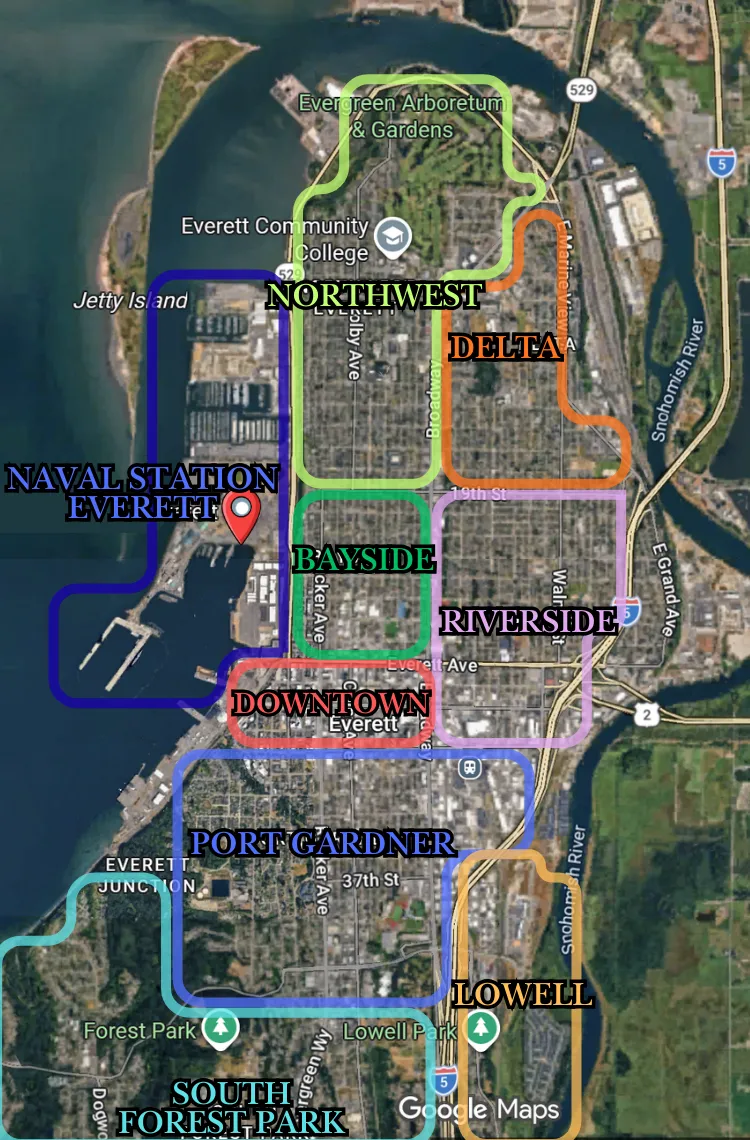 A historic area with many established homes, located closest to Port Gardner Bay (part of the Puget Sound). Homes closer to the southwest waterfront come with a premium price tag, while properties nearer to town and I-5 are generally lower. Crime rates tend to be lower toward the west and moderate to higher closer to I-5 and downtown.